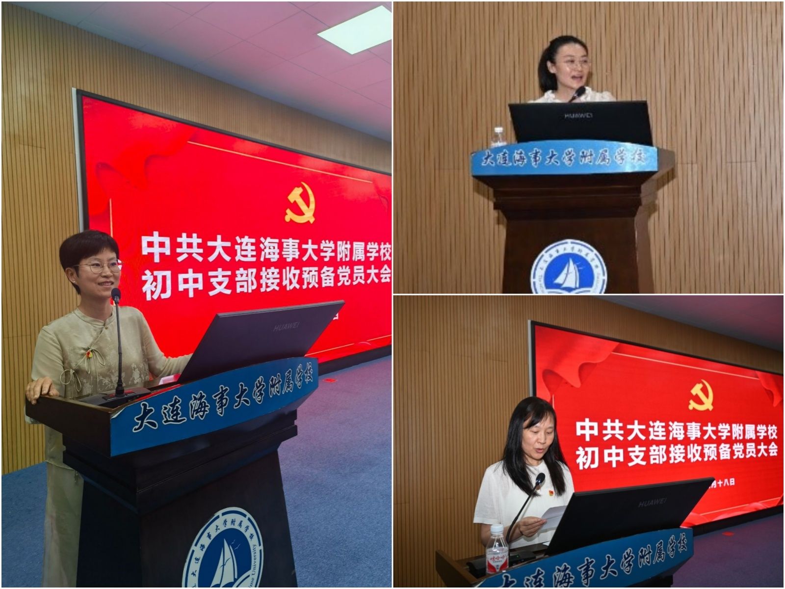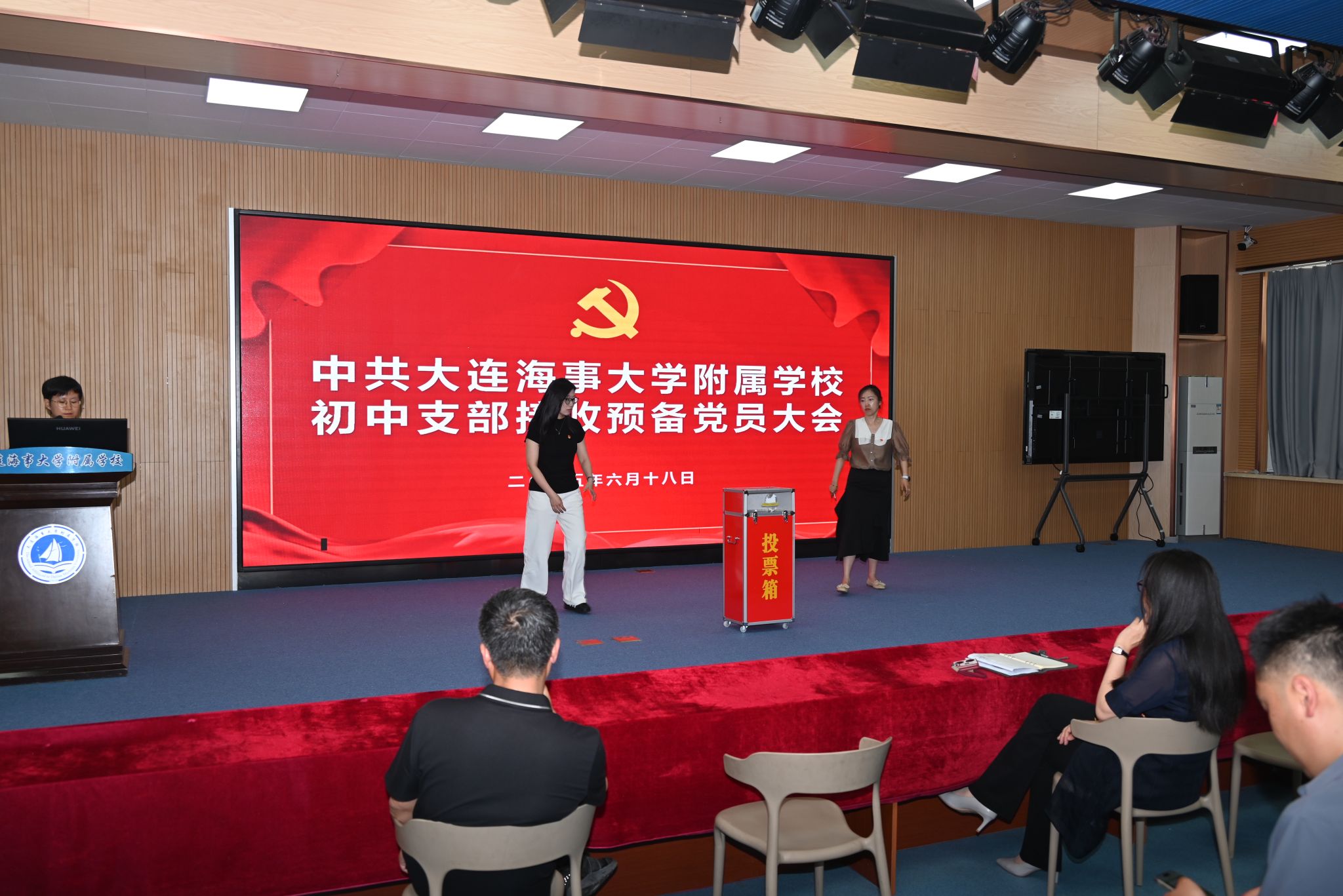 6月18日下午,中共大连海事大学附属学校初中支部委员会在阶梯教室召开接收预备党员大会,审议并通过杨小庆同志的入党申请。会议由党支部书记张乐主持,支部全体党员及入党积极分子参加。
